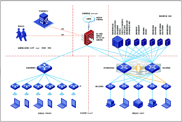 遵循安全、可靠、穩定、高效的原則,把網絡劃分成5個區域。分別是遠程接入區域(L2TP over IPSEC VPN)、互聯網區域(untrust)、服務器區域(DMZ)、辦公區域(trust),其中辦公區域分為有線辦公區域(Lan)和無線辦公區域(Wireless)。